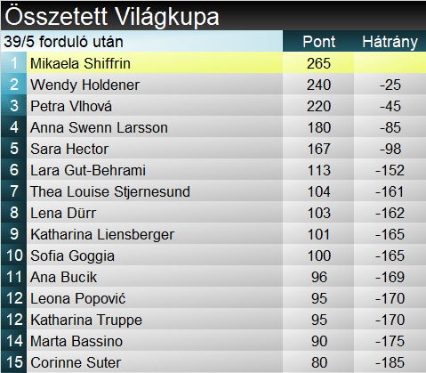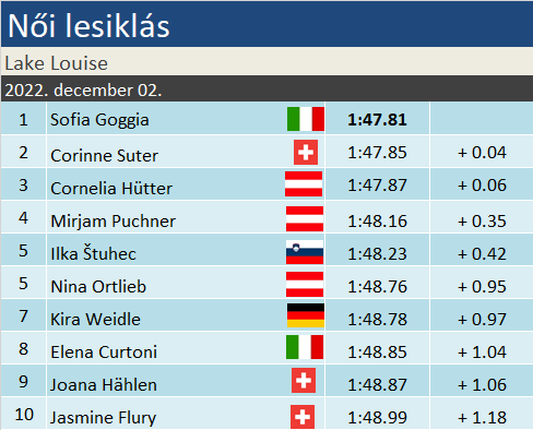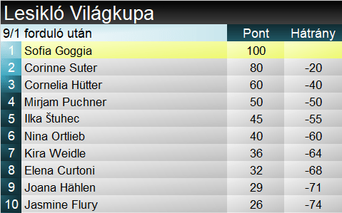 Sofia Goggia 18. sikerét aratta a Világkupában, ezzel beérte Tamara McKinneyt és Anita Wachtert a ranglista 26. helyén. Még kettő választja el az olasz csúcsot tartó Brignonétól. Mint már szó volt róla, zsinórban negyedszer győzött Lake Louise-ban. Corinne Suter 19., Cornelia Hütter pedig 17. dobogójánál tart a legjobbak között.