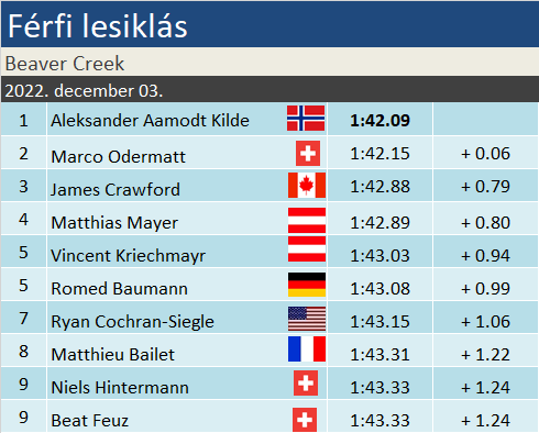 Aleksander Aamodt Kilde 15. győzelmét húzta be a Világkupában, a nyolcadikat lesiklásban. A királyszámban eddig veretlen, de jelen állás szerint izgalmas párharcra lesz kilátás közte és a ma hatodjára dobogóra álló Marco Odermatt között. James Crawford remek edzéscsúszásait ezúttal élesben is meg tudta ismételni, így másodjára végzett pódiumon.