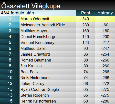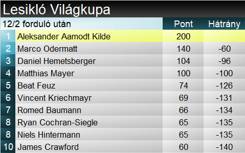 Tovább várat magára Marco Odermatt első lesikló győzelme. A svájciak ifjú sztárja egy kevéssel ismét közelebb került az áhított célhoz, ezúttal 6 század választotta el Aleksander Aamodt Kilde etalonjától. A norvég sikerét fokozza, hogy pár napja még lázasan feküdt ágyában. James Crawford először karrierje során VK-dobogóra állt lesiklásban, miután az osztrákok duója, Mayer és Kriechmayr elkapott egy széllökésekkel terhelt periódust, ezáltal esélyük nem volt előrébb végezni.