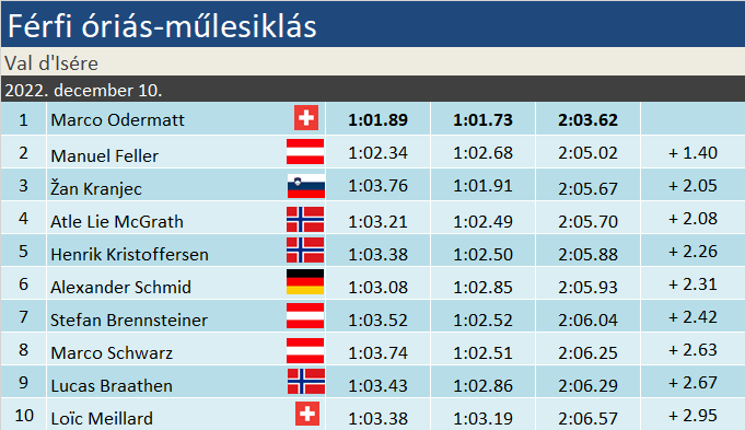 Marco Odermatt 14. győzelmét aratta a Világkupában, ebből a kilencediket óriás-műlesiklásban. Dobogóinak száma elérte a harmincötöt. Idei statisztikája eddig: 6-ból 6! Címvédőként győzött Val d’Iséreben. Manuel Feller 15., míg Kranjec 10. alkalommal állt fel dobogóra. Sölden utána másodjára.