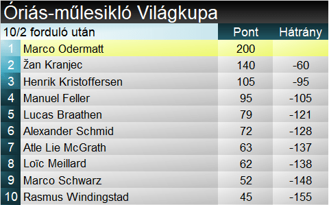Kristoffersen (5.) lécei jól szuperáltak délután, még úgy is, hogy egészen más stílusban tette dolgát, mint elsőre. Nem volt gyengébb szektora, igaz, mindenhol kapott annyit a szlovéntól, hogy egy kevéssel mögé szoruljon. McGrath (4.) a tempó oltárán feláldozta a precizitást. Minimális különbséggel szorult a szlovén mögé. Schmid (6.) határozottan harcban volt a dobogóért. A meredeken két nagyobb megingást láthattunk tőle, s a vége sem sikerült optimálisra. A századok nem szerették, csak a negyedik helyre került. Manuel Feller (2.) tetemes fórról startolt, s tőle nagyritkán látható módon profin lehozta a kötelezőt. Ráment a tutira, vagyis szlovén legyőzésére, Marco Odermattot (1.) pedig elengedte. A svájciak ásza légies könnyedséggel vette birtokba a lejtőt. A meredeket végiguralta, mindezt tette úgy, hogy szemre mintha nem is adott volna bele mindent. Akárhogyan is, zárósízőként behúzta a második futamot is.