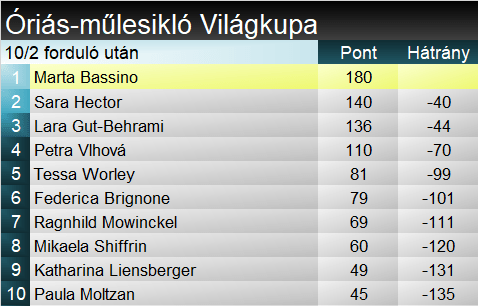 Mint technikai számokban eddig valamennyi alkalommal, izgalmas versenyt hozott az óriás-műlesiklás. Az első futam után hatan követték egymás fél másodpercen belül, s délutánra sem nyílt ki túlontúl az olló. Kockázatvállalóbb habitusának hála Marta Bassino fordítani tudott Petra Vlhovával szemben, sőt a szlovákot még a legjobb délutáni futamot síző Sara Hector is megelőzte. Remekelt másodjára Fede’ Brignone is, aki éppen csak lecsúszott a dobogóról. Worley az ötödik, Shiffrin a hatodik, míg Gut-Behrami a hetedik helyen zárt.