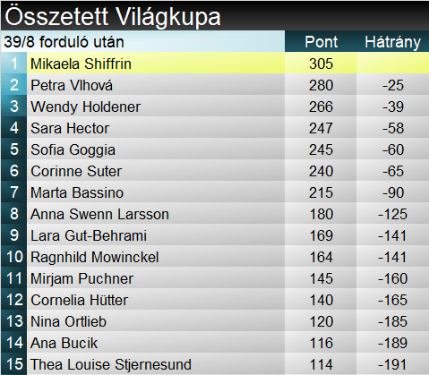 A hazaiak ovációja hamar elcsendesedett. Sara Hector (2.) még egy kicsivel rásrófolt a színvonalra, az árnyékba szorult meredeken világosan felülmúlta az olaszt a szám olimpiai bajnoka. Mowinckel (9.) elszúrta a lankát, a meredeken pedig hiányzott a kompresszió a jégréteggel. Magyarán úgy dobálták a buckák, hogy az valami hihetetlen. Shiffrin (6.) a meredeken esett ki koncentráltságából. Alig fért be az egyik kék kapuba, onnantól fogva már az csoda volt, hogy legalább Gutot megverte. Tessa Worley (5.) letisztultan síelt végig, ezzel együtt közelítőleg sem vállalt annyi kockázatot, mint korábban Brignone, pláne Hector. Egyelőre ott volt a TOP3-ban, pódiumára azért dőreség lett volna feltenni vagyonunkat.