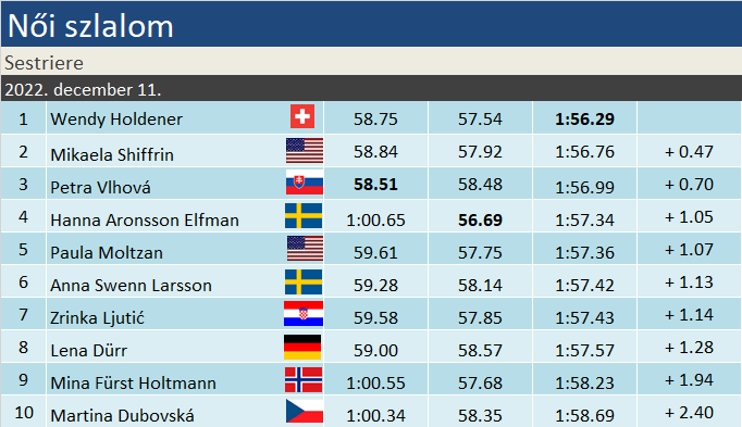 Killington után Sestriere-ben is Wendy Holdener nyerte a női szlalomot. A korábbi örök második remek délutáni sízéssel előzte meg a délelőtt még vezető Petra Vlhovát, aki a harmadik helyre csúszott vissza. Kettejük közé Mikaela Shiffrin fért be. A második futam szenzációját Hanna Aronsson-Elfmann szolgáltatta, aki majdnem a dobogóra is felléphetett!