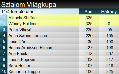Összetettben továbbra is Shiffrin vezet, előnye azonban 19 pontra csökkent Holdenerrel szemben. A szakági tabellán Shiffrin és Holdener pontegyenlőséggel állnak az élen.