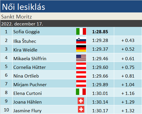 Kéztörés, dobogó, műtét, győzelem – valahogy így nézett ki Sofia Goggia elmúlt 24 órája. Az olasz klasszis a milánói műtéte után visszatért ma reggel St. Moritzba, és lehengerlő sízéssel nyerte meg, az immár egész pályás, második lesiklást. A dobogó második foka sem kis sztori: négy szezon után állhatott pódiumra Ilka Štuhec! A harmadik helyet szoros versenyben Kira Weidle szerezte meg Mikaela Shiffrin előtt, nyomukban egy hármas osztrák különítménnyel és a tegnapi győztes Curtonival.