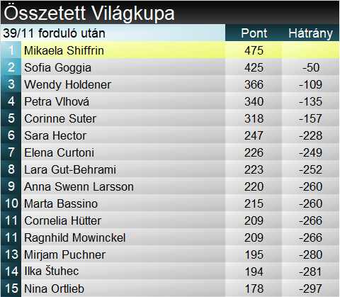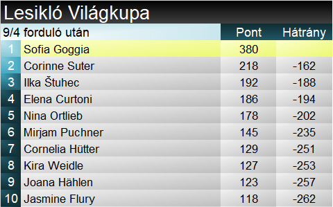 A szakági világkupában Goggia jelentősen növelte előnyét a hibázó Suterrel szemben, immár jócskán 100 pont feletti a távolság kettejük közt. Összetettben Goggia ugyan zárkózott, átugorva Holdenert és Vlhovát is, de Shiffrin épp a mai 50 pontjával vezet az olasz előtt.