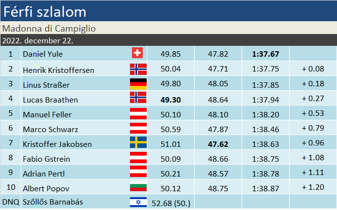 Daniel Yule karrierje harmadik villanyfényes madonnai győzelmét aratta csütörtök este. A svájci a negyedik helyről tört előre, átugorva Henrik Kristoffersent és Linus Straßert. Az első futam után még vezető Lucas Braathen gyengébb második futamot síelt, amivel a dobogóról is lecsúszott. Ugyan a dobogóról lemaradtak, de erős napot zártak az osztrákok – négyen is a legjobb tízben végeztek. Yule öt verseny óta tartó norvég győzelmi sorozatot tört meg. Szőllős Barnabás az első futamban 50. helyen végzett, így nem jutott tovább.