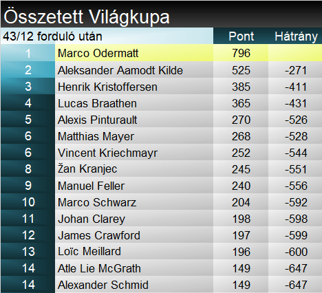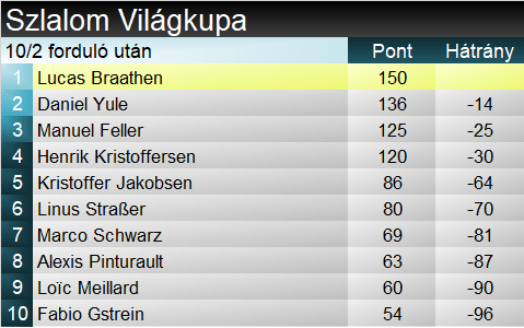 Henrik Kristoffersen (5.) révén továbbra is kis különbségeket láthattunk, de a norvég a meredeken húzott kövér ívei miatt nem tudta megelőzni az eddig beérkezőket. Nem így Lucas Braathen (1.), aki az eddigi szoros eredményt brutális meredekkel borította, és 4 tizedet vert Meillard-ra. Manuel Feller (8.) hátfájdalmakra panaszkodott, minden bizonnyal ez is benne volt apróbb hibáiban. Clément Noël (15.) továbbra sem találja formáját. Merev, feszülős sízést láthattunk tőle, számos rontással. Elsőként került másodpercen kívülre.