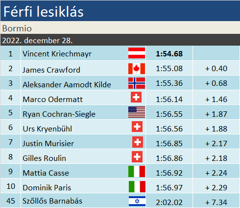 A kétszeres világbajnok bizakodásra okot adó formában néz neki a januári klasszikusoknak, miután a Dolomitok mindkét lejtőjén behúzott egy-egy győzelmet. A Pista Stelvio kegyetlenül jeges arcát mutatta, ami brutálisan kemény kihívás, masszív veszélyhelyzet elé állította a mezőnyt. Méretes különbségek alakultak ki, a pontszerző zónát 4 másodperc választotta el egymástól. James Crawford fiatal kora ellenére vérrutinos sízőként tette dolgát, rajta kívül még Aleksander Aamodt Kilde állt fel a dobogóra. Az összetettet tekintve fontos, hogy Marco Odermatt – a beszedett 8 tizedes hátrány ellenére – csupán egyetlen pozícióval szorult a norvég mögé. Cochran-Siegle egy erős ötödik hellyel hangolt a csütörtöki Szuper-G-re, míg hatodikként Kryenbühl zárt – azok után, hogy az óév elején, Kitzbühelben horrorbalesetet szenvedett. Az olaszok közül Casse lett a legjobb, egy hellyel megelőzve a tízedik Parist. Szőllős Barnabás tisztességgel helytállt , a 45. helyen fejezte be élete első bormiói lesiklását.