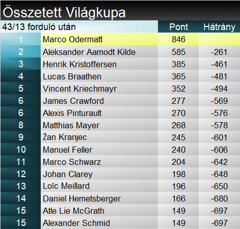 Vincent Kriechmayr 14. elsőségét szerezte a Világkupában, a két gyorsasági szám arányát egalizálta. A grödeni első lesiklás után újabb klasszikust nyert, s bizony jó úton halad a vb-címvédés felé. James Crawford élete legjobbját síelte lesiklásban, összességében harmadszor ünnepelt dobogón. Nincs mese, megérkezett a világelitbe a kanadai! Aleksander Aamodt Kilde rendkívül stabil formát mutat: öt futam, 3 győzelem, 5 dobogó, egy 5. hely. Lassanként egy komplett sikernyivel vezeti a szakágit. De hiába a domináns lesiklás, ha egyszer Odermatt is odaért a legjobbak szintjére… Egyébként 35 VK-dobogónál tart, ebből 14-et jegyez lesiklásban.