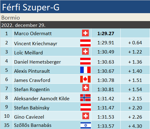 Két világklasszisról szólt a mai nap Bormióban. Miután reggel, teljesen váratlanul bejelentette visszavonulását Matthias Mayer, az osztrákok háromszoros olimpiai bajnoka, Marco Odermatt vérbeli erődemonstrációt tartott a Stelvión. Agyonverte a mezőnyt Szuper-G-ben, egyedül a szintén bombaformának örvendő Vincent Kriechmayr szorongatta meg egy kicsikét, már amennyiben a 6 tizedes differenciát szorosnak tituláljuk. A többiek? A bravúros dobogót jegyző Loïc Meillard, a vb-indulást alighanem bebiztosító Hemetsberger, vagy a kanyargós pályán elemében lévő Pinturault, illetőleg a ma is önbizalom terén túlfűtött Crawford már bőven másodpercen túl követték a svájcit. A legnagyobb vetélytárs Aleksander Aamodt Kilde ráadásul alaposan elrontotta futamának végét, mostani nyolcadik helye a későbbiekben még sokba kerülhet neki. Az izraeli-magyar Szőllős Barnabás eddigi legjobb Világkupa-szereplését nyújtotta. Alig fél másodperccel szorult a pontzónán kívülre, így 56 indulóból a 35. helyen zárt Szuper-G-ben.