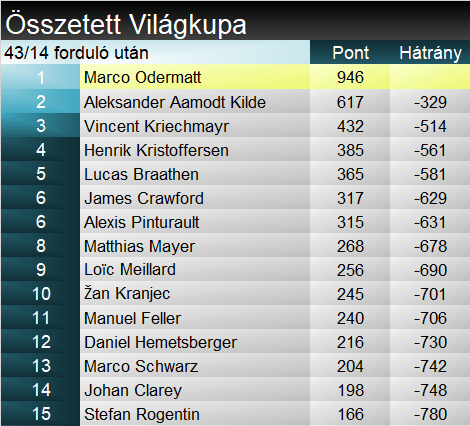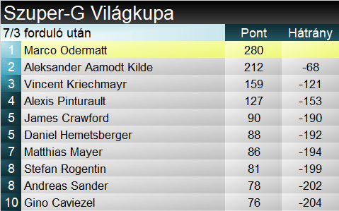 Marco Odermatt úton van Herminator 2000 pontos rekordjának megdöntése felé. Ötödik győzelmét aratta ebben a szezonban, összességében tizenhatnál jár, ebből hatot szerzett Szuper-G-ben. Vincent Kriechmayr formájára sem lehet panasza az osztrákoknak, harmadik dobogójából az első jegyzi idén Szuper-G-ben. Összességében harmincnál tart. Loïc Meillard immáron az ötödik különböző szakágban állt fel dobogóra, már csak a lesiklás hiányzik a palettáról. Ha nem egy földöntúli lény kortársáról beszélnénk, összetett reményekről kellene írnunk, de így nem tesszük. Egyébiránt ez a mai Meillard tizenegyedik TOP3-a.