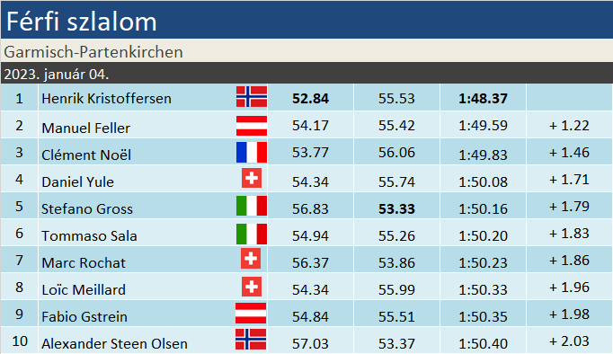 Henrik Kristoffersen 29. VK-győzelmét aratta, amivel beérte az örökranglistán Stephan Eberhartert. A szakágban 22. alkalommal nem talált legyőzőre. Ahogy azt a győzelmi interjúban is megjegyezte, ez a Van Deer-Red Bull első győzelme – kérdés a szövetség ezek után meddig titkolja minden fronton a márka létezését is… Manuel Feller 18-szor állt már karrierje során dobogóra. Idén háromszor, mindegyik alkalommal 1 lépésre a győzelemtől. Ugyanennyi dobogónál tart Clèmant Noёl is. A regnáló olimpiai bajnok két nullázást követően idén először szerzett pontot.