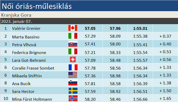 Parádésan izgalmas versenyt és szenzációs kanadai győzelmet hozott az első Kranjska Gora-i óriás-műlesiklás. Majdnem 20 év elteltével győzött újra a juharlevelesek válogatottjából érkező síző óriásban, női viszonylatban pedig fél évszázad után következett be ez a hőstett. Valérie Grenier az eddigiekben is fitogtatta remek formáját, mai sikere ennek fényében is komoly meglepetés. Marta Bassino újabb dobogójával növelte előnyét a pontversenyben, míg a harmadik helyet az éledezőfélben lévő Petra Vlhová kasszírozta be. Brignone, Gut-Behrami, valamint a Shiffrin- Frasse Sombet páros fért még a legjobb hat/hét közé. A legjobb osztrák ezúttal is Gritsch lett, mégpedig egy szolid 12. helyezéssel. A TOP10-ben egyébiránt kilenc nemzet képviselője végzett.