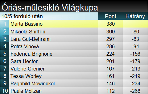 Marta Bassino huszadik dobogójánál tart óriás-műlesiklásban, a mostani szezonban mind az öt versenyen ott végzett. Megérdemelten vezet 80 pont előnnyel a szezon felénél. Petra Vlhová 17., idei harmadik dobogóját szerezte óriásban.