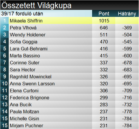 Heten álltak fél, tucatnyian egy szekundum környékén az elejében, s még várakozott néhány potenciális síző a startállásban. Ramone Siebenhofer (29.) jelen formájában az utolsóelőtti pozícióra volt jó, Wendy Holdener (17.) gyengélkedett a meredeken, Ricarda Haaser (21.) bátorsága a zöld nyitószektor után felemésztette energiáját. Akárcsak tavaly még vérmes reményekkel várhatták a hazai versenyüket a szlovénok. Aztán jött egy sérüléshullám és Hrovat váratlanul visszavonulása, így maradt nekik „egy” (sic!) Ana Bucik (9.). Feldobta őt a miliő, vagánysága ésszerűséggel párosult, talán a végére fogyott el kicsit a szufla. 6 tizeddel maradt el a dobogó aljától. Maria Therese Tviberg (22.), majd Camille Rast (20.) a másfél-két másodperces tartományba érkezett, ahol egyébiránt szintén szorosan alakultak a dolgok.