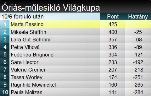 Marta Bassino továbbra is vezeti a szakági világkupát, előnye viszont 25 pontosra olvadt. Az olaszt Shiffrin követi, majd Gut-Behrami és és Vlhová vannak még 100 ponton belül. Összetettben Shiffrin előnye tetemes, 419 ponttal vezet Vlhová előtt.
