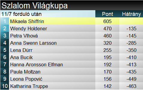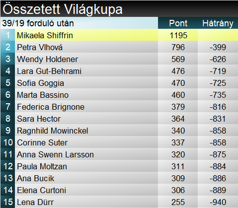 A szakági pontversenyben 3 versennyel a szezon vége előtt Shiffirn előnye 135 pontra nőtt Holdener előtt. A svájcira viszont felzárkózott mai győzelmével Vlhová. Az összetettben az élen a helyzet változatlan, Shiffrin előnye viszont 400 pont alá, 399 pontra csökkent…
