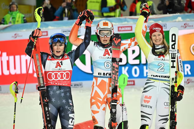 Petra Vlhová idén már hét alkalommal maradt le a győzelemről dobogóval, nyolcadszorra viszont már nem tágított. Flachauban harmadszor nyert már. Összességében 27 sikernél tart, amivel beérte Maria Höfl-Riescht és Phil Mahre-t az örökranglistán. Mikaela Shiffrin idei 10. pódiumát ünnepelhette, viszont a mai mindössze a második alkalom, hogy nem annak tetejére állhatott fel. Lena Dürr 7. alkalommal végzett dobogón, a moszkvai parallel győzelmét leszámítva minden alkalommal szlalomban. Az osztrák helyszínek egyébként jó ómennek bizonyulnak, Schladming és Semmering után Flachauból is van már dobogója.
