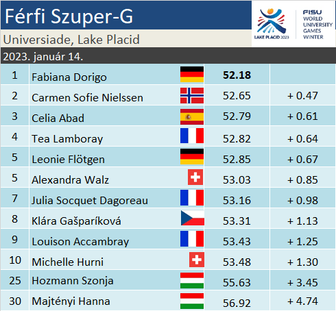 Fabiana Dorigo (1.) sízésén pedig a német iskola érződött. Jól kimunkált léctartással, rezzenéstelenül süvített át a kanyarokon. A bőven másodpercen túli előnnyel alaposan beárazta az addig látottakat. A másik német, Sophia Eckstein (19.) nem igazán rúgott labdába, ha innen nézzük, nagy fegyvertény volt viszont az ukrán testvérpár jobbik tagjától, Anasztaszja Sepilenkótól (11.), hogy ha egy percig is, de dobogón érezhette magát. (Katerina keveseket előzött meg.) Jöttek ugyanis a svájciak. Alexandra Walz (6.) révén megint dinamika költözött a kanyarokban, még ha fent akadt két enyhe túlcsúszása. A per pillanat második helyezett kolleginája után Michelle Hurni (10.) két szektor után már jobban is állt a német éllovasnál, de aztán a záró csúszásban ő is bekapta a maga másodpercét tőle. A hullámokkal teletűzdelt középső részen azért bőven lehetett hozni a németen, ezt a cseh Klára Gašparíková (8.) is igazolta. Carmen Sofie Nielssen (2.) részéről rossz szektort nem lehetett feljegyezni, vállalható tempóját jó íveken vitte végig, s minthogy a zárószakaszt jó aerodinamikával oldotta meg, besorolt a második helyre.