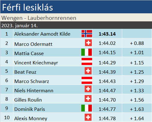 Aleksander Aamodt Kilde a idei 6., összességében 19. győzelmét aratta. Wengenben harmadszor nem talált legyőzőre, de érdekesség, hogy mindhárom alkalommal a Hundschopf feletti rajtból indították a versenyzőket. Marco Odermatt 42. dobogós helyezését szerezte, a 8.-at a leggyorsabb számban. Mattia Casse decemberi első dobogója után végzett ismét ilyen előkelő helyen.