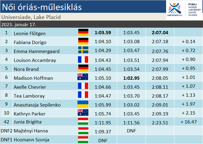Kettős német győzelem született női óriás-műlesiklásban a Lake Placidon zajló Téli Egyetemi Világjátékokon. A kombinációban bronzérmes Leonie Flötgen győzött megelőzve a Szuper-G bajnoknőjét, Fabiana Dorigót. A bronz ezúttal a svéd Emma Hammergaardnak jutott. A három magyar indulóból Junia Brigitta szerzett helyezést, a 80 fős mezőnyben a 42. helyen végzett. Megelőzött tíz célba érőt, hátránya egy nagyságrendre helyezte három kanadai lánnyal. Élete első felnőtt világversenyén ez igenis szép eredmény. Hozmann Szonja az első, Majtényi Hanna a második futamban esett ki.