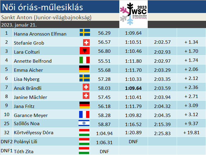 Hanna Aronsson Elfmant nem kell senkinek sem bemutatni. Szlalomban már most ott van a világ legjobbjai között, mind a hat alkalommal a legjobb tizenegy közt végzett a jelenleg futó szezonban. Óriás-műlesiklásban kevésbé örvendett jó formának, három pontszerző helyet tavaly szerezte. A 20 esztendős svédnek ez a harmadik junior-vb-jén a második aranyérme, a 2021-es banszkói megmérettetésen győzött, ugyancsak óriás-műlesiklásban. Stefanie Grobról pedig egész biztosan sokat fogunk hallani a jövőben. Negyedik számban a negyedik érmét szerezte: győzött lesiklásban, másodikként zárt Szuper-G-ben, s ma óriásban, a kombinációs csapatversenyben pedig egy bronzzal gazdagodott. Lara Colturi a mezőny legfiatalabb tagjaként eddig nem adta alább a negyedik helynél. Szuper-G-n aratott győzelmét ma bronzzal egészítette ki.