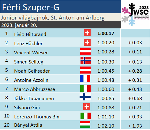 Kettős svájci győzelmet hozott a férfiak szuperóriás-műlesiklása a Sankt Antonban zajló junior-világbajnokságon. A roppant technikás pálya sorra szedte áldozatait, csaknem a mezőny fele elvérzett a lejtőn. Bányai Attila nem tartozott közéjük. Abszolút sorrendben a remek 20. helyezést szerezte meg, míg az U18-as kategóriában újabb bronzéremmel gazdagodott. A kombinációs csapatversenyben olasz siker született. Úry Bálint lendületes sízésével nem ért célba.