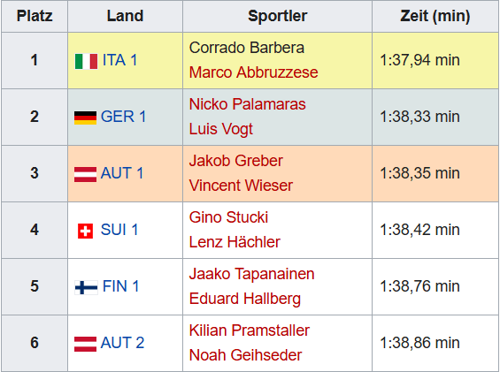 A kombinációs csapatversenyt tehát az 1-es számú olasz csapat nyerte meg Marco Abbruzzese és Corrado Barbera révén. Az ezüstérem a németeknek (Luis Vogt és Nicko Palamaras), a bronz pedig az osztrákoknak (Vincent Wieser és Jakob Greber) jutott.