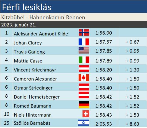 Aleksander Aamodt Kilde lehengerlő sízéssel győzött a Hahnenkammrennenen, Kitzbühelben. A norvég a pálya teljes egészét szinte uralta, így az egyébként szintén remeklő Johan Clarey ismét lemaradt karrierje első győzelméről, immár 42 évesen. A dobogó alsó fokát két szélvészgyors szektorral Travis Ganong szerezte meg. Mattia Casse 4 századdal maradt le a dobogóról, míg a tegnapi győztes Kriechmayr az 5. helyen végzett. A mai napon pedig elbúcsúzott az alpesi sí közösség Beat Feuztól is.