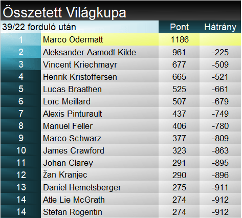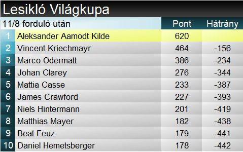 A lesikló világkupában Kilde előnye meglehetősen komoly, raádásul már Kriechmayr mögött, miután a kitzbüheli hétvégét Odermatt pont nélkül zárta. Az összetettben Kilde 225 pontra zárkózott, itt az lesz a kérdés, Odermatt tegnapi sérülése mennyire veti vissza őt a szezon további részében. A harmadik helyen Kriechmayr megelőzte Kristoffersent.
