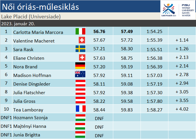 Carlotta Maria Marcora fölényesen, mindkét futamon a legjobb időt síelve nyerte az Universiade utolsó női versenyét. Az olasz hölgy mögött a svájci Macheret és a svéd Rask fért fel a dobogóra. A magyar lányok sajnos az első futamban kiestek. A csütörtöki csapatversenyben szépen helytállt a magyar válogatott, hiszen valós küzdelemre késztették a későbbi aranyérmes svédeket.