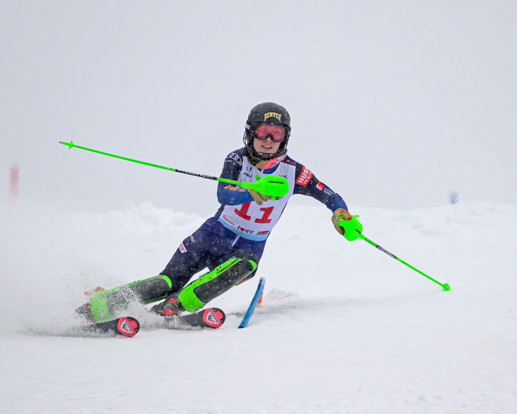 A szlovákok edzője sűrű nyomvonalat álmodott meg, nem kevesebb, mint 70 stangli várt a lányokra. Elsőként Valentine Machelet (5.) startolt el. Combos alapidőt állított fel, menetébe egyetlen érdemi hiba sem csúszott, esetleg még egy kis pluszlendület itt-ott elfért volna. A legmagasabban jegyzett osztrákkal szemben ennyi is bőven elegendő volt. Julia Grossnak (9.) többször bele kellett fékeznie. Nora Brand (2.) kezdettől fogva jobb ritmust diktált, s noha a végén akadt pár kövér kapuvétele, végtempójára megint csak nem lehetett panasz. Jó fél másodperccel állt élre. Carissa Cassidy (13.) különösen a lejtő második felén csúszkált távol a stangliktól. Az első amerikai alpesi érem továbbra is váratott magára… Carlotta Maria Marcora (1.) sízése közel volt a tökéleteshez. Kiváltképp a meredeken volt kiváló, jó négy tizedes előnnyel nyerte a délelőtti futamot. Eliane Christen (4.) a relatíve lankásabb szakaszon jobb sebességet diktált, a végén viszont beszedett egy komplett másodpercet az ott önkívületit nyújtó olasztól. Két kiesés egymás után és ugyanott: Hedda Martelleur és az ausztrál Kathryn Parker ugyanabba a vertikális kombinációba bonyolódott bele.