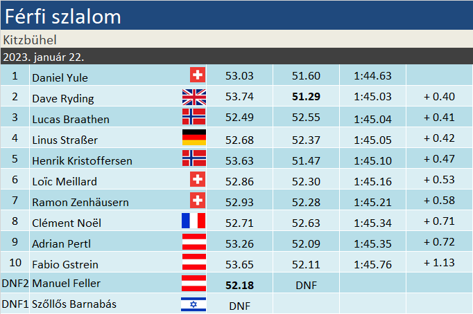 Kis éllel azt is lehetne mondani, a tavalyi angol siker után idén kettős brit győzelem született a Ganslernhangon. Daniel Yule nyerte ugyanis a kitzi szlalomot, a második futamban 6 helyet javítva, míg a tavalyi győztes Dave Ryding a 16. helyről, a délután legjobb idejével lett második. A két jó barát sikeréhez kellett az is, hogy az első futamban vezető Feller pár kanyar után kapura lépett, míg Braathen és Straßer egyszerűen nem tudtak hiba nélkül, kellően gyorsan síelni. Az osztrákok renoméját Pertl és Gstrein mentette valamelyest a 9-10. helyen.