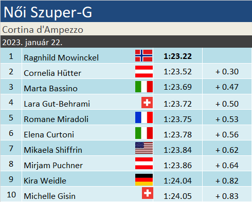 Ragnhild Mowinckel igazolta egész szezonban meglévő jó formáját, és megnyerte a cortinai szuper-G versenyt. A norvég lehengerlő menettel előzi Cornelia Hüttert és Marta Bassinót. Bassino mögött egyébként rendkívül szorosan alakult a verseny, Gut-Behrami Miradoli és Curtoni is századokkal maradt le a dobogóról.