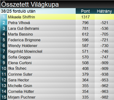 Összetettben Shiffrin toronymagasan vezet, Vlhová és Gut-Behrami előtt. A szakági világkupában Mowinckel visszavette a vezetést mai sikerével. Gut-Behrami továbbra is második, az eddigi listavezető Brignone a harmadik helyre csúszott vissza.