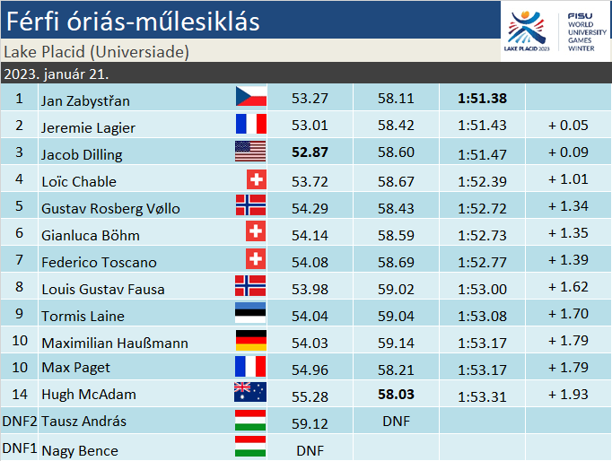 A hideg téli idő a zárónapra is kitartott a Whiteface Mountainen, szerencsére a női szlalomon tapasztalt ködnek nyoma sem volt. Az osztrák edző által tűzött első pályát tökéletesen belátták a résztvevők. Ulysse Cretint a második letöréshez rakott vertikális kombinációs követően „ugrasztotta” ki a kompresszió. A rossz kezdés után egyébként tegnap egyáltalán nem hullottak nagy számban sízők. Jacob Dilling (1.) szép ritmusos menetével olyan alapidőt állított fel, amit senki nem múlt felül délelőtt. Alaposan meggyűlt Federico Toscano (11.) baja a trükkös tűzéssel, a gyakori térvesztések másodpercen túli hátrányt hoztak a svájcinak. Louis Gustav Fausa (8.) a lankán egy árnyalatnyival jobb volt, a záró letöréstől esetében is kinyílt az olló. Jeremie Lagier (2.) jó ritmust talált a lankán, ám 3 tizedes előny sem volt elegendő a végéig. Igaz, a másfél tizedes különbség nem volt releváns. Takeucsi Rion (16.) széles kanyarjaival a leszakadók csoportjához csatlakozott, a svéd Gustav Dalmalm (7.) többet kockáztatott, ezzel együtt csak pár tizeddel ment jobbat a japánnál.