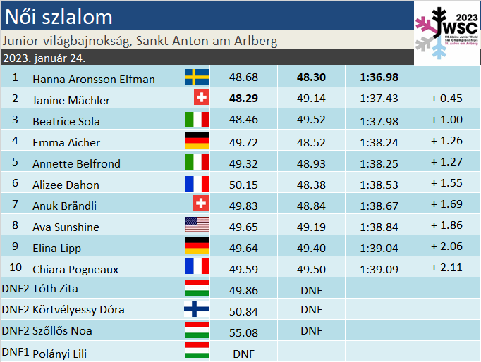 A címvédő Ljutić hiányában egy nagy esélyessel kevesebb, ezzel együtt remek kis versenyt hozott az utolsó női erőpróba Sankt Antonban. Hanna Aronsson Elfman pedig kihasználta az esélyt, s az óriás után behúzta a másik technikai számot is, ezzel háromszoros junior-világbajnokként fordulat rá most már tényleg a felnőtt karrierre. A svájciak Janine Mächler révén újabb értékes éremmel gazdagodtak, míg a jelenleg roppant soványka olasz női műlesiklás örülhet Beatrice Sola bronzának. Szegény Emma Aicher újabb egyéni számban végzett a TOP6-ban, konkrétabban a negyedik helyen, de az előzetesen elvárt érmekből egyetlenegyet sem sikerült megszereznie. A magyar lányok sajnos egytől egyig kiestek.