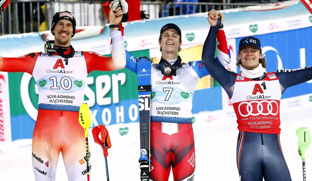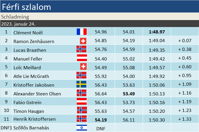 Fordulatos versenyt hozott a schladmingi éjszakai szlalom, ahol az első futam dobogósait egytől egyig túlvállalták magukat, így 4-6. helyezettek ünnepelhettek fordított sorrendben. Clèment Noël mindössze 7 századdal előzte Ramon Zenhäusernt. Lucas Braathen 3. helyével megőrizte a szakági vezetést, miután Kristoffersen az élről síelt pocsék futamot. Feller a 2. helyről csúszott vissza a dobogósok mögé, de ezzel az osztrák válogatott legalább elkerülte a kitzbühelihez hasonló lebőgést.