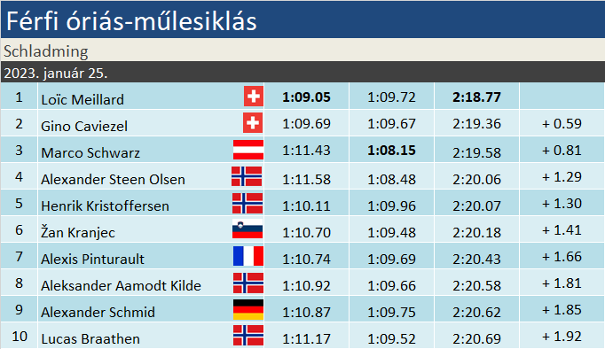 Schwarz dobogója biztossá vált, a svájciak viszont már nem hibáztak. Caviezel (2.) nagy adagokban tékozolta el hozott fórját, a súlypontáthelyezésekkel megszenvedett, ám a legvégén újítani tudott. Meillard (1.) tehát egy tehertől mentesült, hiszen nem rajta állt, vagy bukott a helvét napi siker. Higgadtabb kezdés után a meredeket szépen megnyomta, a zárásnál pedig csaknem visszaépítette előnyét. Megszületett az első klasszikus számban elért VK-sikere!
