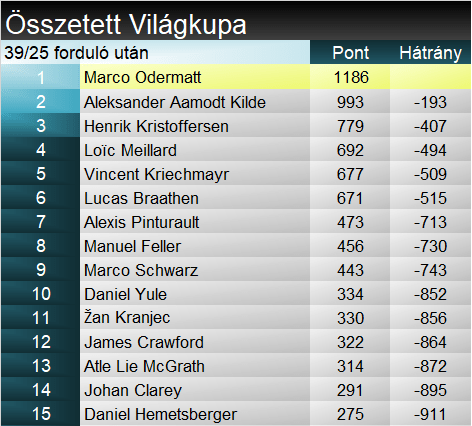 Aleksander Aamodt Kilde (8.) természetesen nem volt rest elindulni Schladmingba, látta az esélyeket a mai versenyben. Az ambícióval nem volt gond, a lendületes kapukombinációkat pazarul oldotta meg, s bár nem ment minden kanyar tükörsimán, ott is hozta formáját. Maradt esélye még nagyobb pontmennyiségre is. River Radamus (12.) ezúttal ésszel adagolta a tempót, ami – minő meglepő – erős kiindulási pozíciót eredményezett. Harmincig jól mentek az osztrákok, Raphael Haaser (24-essel a 11.) és Roland Leitinger (26-ossal a 14.) is bőven rajtszáma „felett” teljesített. Nem írunk azzal meglepetést, hogy harmincon túlról Alexander Steen Olsen (34-essel a 17.) síelte a legnagyobbat, rajta kívül még ebből a dimenzióból jutott tovább Stefan Luitz (31-essel a 29.), Semyel Bissig (32-essel a 30.), Livio Simonet (35-össel a 24.), Adam Žampa (40-essel a 22.), az amerikai Brian McLaughlin (42-essel a 28.), s végül a dél-tiroli Hannes Zingerle (58-assal a 26.).