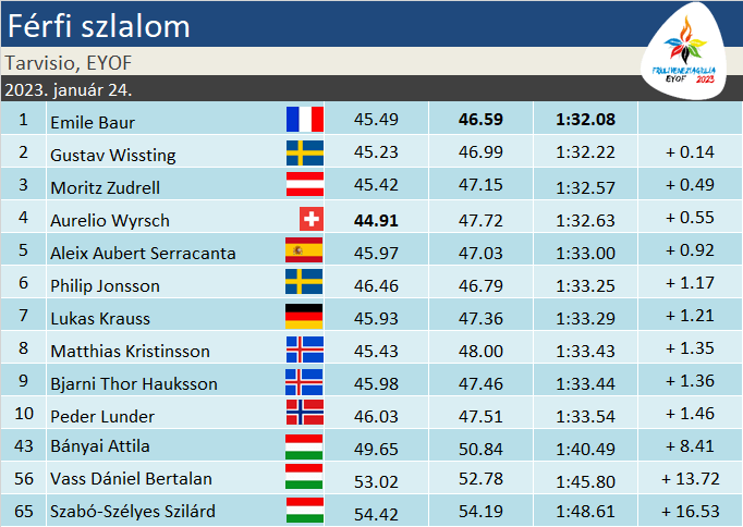 A magyarok közül Bányai Attila (56-ossal a 41.) szerepelt a legjobban. Ati nem az a kiköpött műlesikló alkat, mint láttuk a junior-vb-n, inkább a gyors számokban eredményes, ehhez mérten egész tisztességes dinamikával haladt a stanglik közt. Közel öt s-et kapott. Vass Dániel (75-össel a 68.) nyolc, míg Szabó-Szélyes Szilárd (86-ossal a 76.) kilenc és feles hátrányból várta a folytatást.