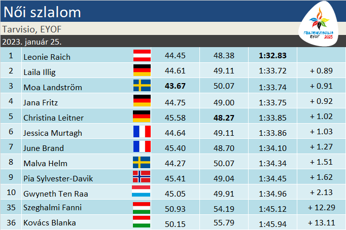 A magyar lányok megharcolták a magukat, s leértek. Kovács Blanka (36.) hét, Szeghalmi Fanni (35.) 5 és fél másodpercet kapott, s mint látszik, helycsere történt kettejük között a tabellán. Mindketten a mezőny első felében végeztek, ami feltétlenül jó szereplésnek számít tőlük.