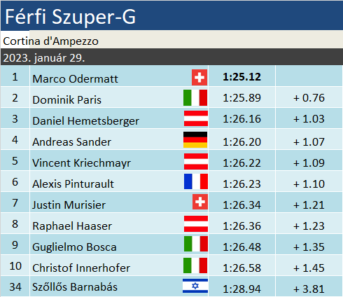 Marco Odermatt a 19. győzelmét aratta a Világkupában, ebből a nyolcadikat ezen a télen. A meniszkuszsérülés nyoma sem eredményességén, sem pedig mozgásán nem érződik. Kilde kiesésével puszta formalitássá devalválódott a maradék két Szuper-G-verseny, ami a szakági kristálygömbért vívott küzdelmet illeti. Dominik Paris a vb közeledtével fokozatosan lendült mind jobb formába. Először állt idén dobogóra, Szuper-G tekintetében 2019 decembere óta nem volt rá példa. Daniel Hemetsberger pedig még sosem végzett TOP3-ban a kanyargósabb gyors számban. Eddigi legjobb eredménye bormiói 4. helye volt a szakágban.