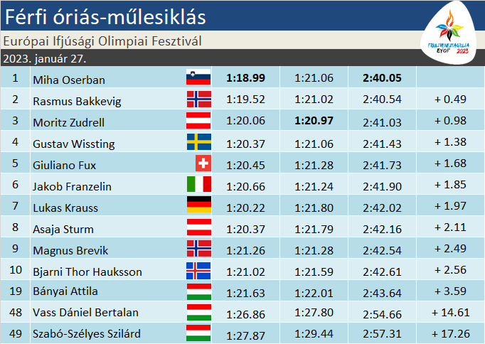 Alig-alig estek ki a fiúk, ezért különösen nagy fegyvertény volt Bányai Attila (26-ossal a 18.) szereplése. A másnapi EYOF-győztes visszafogottabb kezdés után TOP10-es zárást produkált, így alig kapott két és fél másodpercet. A többi magyar az elvártak szerint teljesített. Vass Dániel (65-össel az 51.) nyolc, Szabó-Szélyes Szilárd (70-essel az 50.) kilenc másodperces hátrányt szedett össze.