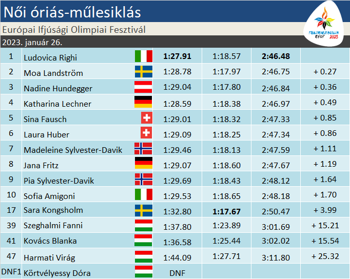 Ami a magyarokat illeti, a 87 fős mezőny középső harmada volt tőlük a realitás. Négyen indultak, közülük hárman folytathatták, Körtvélyessy Dóra sajnos a szlalom után óriásban sem szerzett helyezést. A többiek közül Kovács Blanka (59-essel a 47.) és Szeghalmi Fanni (57-essel a 48.) között nagyjából egy másodperc döntött. Egyikük sem ment tisztán, de legalább becsülettel odatették magukat. Harmati Virág (69-essel az 57.) jelentősen elmaradt kettejüktől, igaz, a második futamban időkülönbségekből kiindulva bizonyára nagyot ronthatott délelőtt.