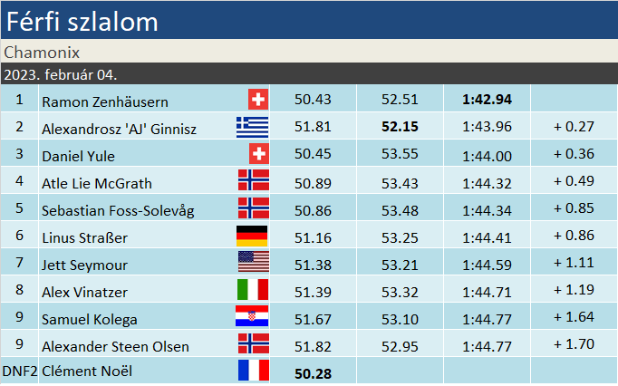 Ramon Zenhäusern mélyről tört mind előrébb, sikertelen tavalyi szezonja után kicsúszott a ranglista legjobb 22 sízője közül, s kétségessé vált szereplése a vb-n. Ehhez képest lépésről lépésre javult, ma pedig megszerezte pályafutása ötödik VK-elsőségét. Legutóbb 2020 decemberében, Alta Badián csendült fel tiszteletére a svájci himnusz. Chamonix egyébként jól megy Ramonnak, két éve ugyanitt kétszer végzett a második helyen. Alexandrosz Ginnisz története beleillene egy görög népmesébe. Görögország szülöttje, görög síedző apa gyermeke, aki ezután Ausztriában kezdett el versenysíelni, majd Vermontban az amerikai csapat színeiben kezdte el karrierjét. Nyolc évvel ezelőtt bronzérmet szerzett a junior-vb-n Kristoffersen és Schwarz kettőse mögött, ill. Noël és Meillard előtt. A 2016-os madonnai VK-n szerzett először pontokat, a két évvel ezelőtti flachaui szlalomon már görög színekben tette meg ugyanezt – egy 11. hely formájában. Idén Val d’Isére-ben második futamot síelt, de ott rontott, Adelbodenben viszont mindkétszer leért. Újabb ország iratkozott fel a VK-dobogósok névsorába. Daniel Yule 15. alkalommal végzett dobogón, idén harmadjára.