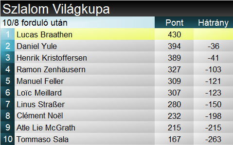 Az eredmények szerencsés alakulása végett Lucas Braathen megőrizte vezető helyét a tabellán akkor, amikor már csak két versenynap van hátra. Az összetettben érdemi változás nem történt, mivel az első nyolc helyezett ma egyáltalán nem szerzett pontot.
