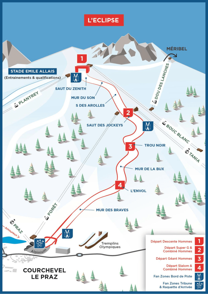A férfi versenyekhez egy újonnan kialakított pályát, a L’Éclipse, azaz Napfogyatkozás lejtőt fogják használni. A név beszédes, a versenyzőket folyamatosan a fény-árnyék váltakozása fogja kísérni, a Col de la Loze hegyen található rajttól egészen a Méribelben található célig. A pálya alapvetően meredeksége miatt kiemelkedő, átlagos lejtése 30%, amely még a Streifet is meghaladja (igaz, a kitzi pályán található egy jó hosszú, szinte lapos szakasz a Karussel után). A lejtésnek köszönhetően a szervezők azt várják, a versenyzők akár 140 km/h-s sebességig is gyorsulhatnak majd.